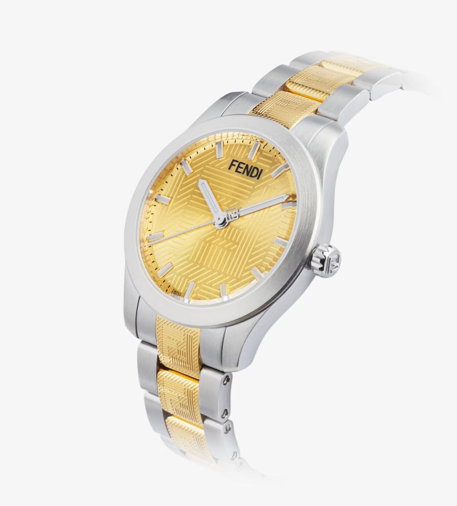 إطار مدوّر 40 مم مصنوع من ستينلس ستيل (stainless steel) باللون الفضي بلمسة نهائية من الساتان (satin) مع تفاصيل لامعة على الجانب. لمسة نهائية لامعة على الإطار، وتاج لامع مع شعار FF بارز. مينا باللون الأصفر الذهبي بتصميم أشعة الشمس مع علامة FF Shadow محفورة، وعقارب دقائق وثوانٍ باللون الفضي مع LumiNova C1 وعلامة فندي باللون الفضي. سوار من ستينلس ستيل (stainless steel) باللون الفضي مقاس 20/18 مم، ووصلات مركزية لامعة باللون الأصفر الذهبي مزيّنة بعلامة FF محفورة ومشبك قابل للطي.